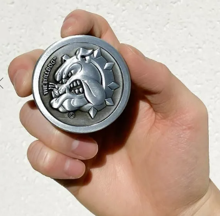 表面はマットな金属仕上げで、蓋には公式のブルドッグマークがフルサイズで彫刻。