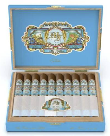 レザー、カイエン、ウッドの香りに、ほのかな甘さとドライフルーツの香りが加わり、ミディアムからフルボディの味わいに仕上がっています。マイ・ファーザー・ブルー葉巻は、ホンジュラス国旗をイメージした鮮やかな青と白のバンドと箱で包まれています。